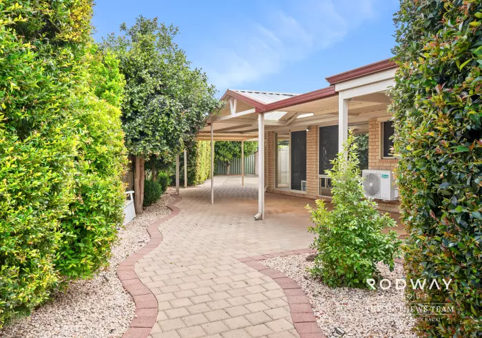 The exterior of the home is just as impressive. The front of the property has strong street appeal with well-kept lawns and garden beds. Parking is plentiful, with space for three to four cars on the driveway and two additional parking spots under the carport, which includes a secure garage door. A side gate on the left of the home provides easy access to the alfresco area without needing to enter through the main door. A neat paved pathway leads through manicured garden beds and the feature lighting adds a warm, welcoming touch. The backyard is equally well-presented with well kept lawn, established hedging and a small garden shed for extra storage. Solar panels are installed, offering energy efficiency and potential savings.